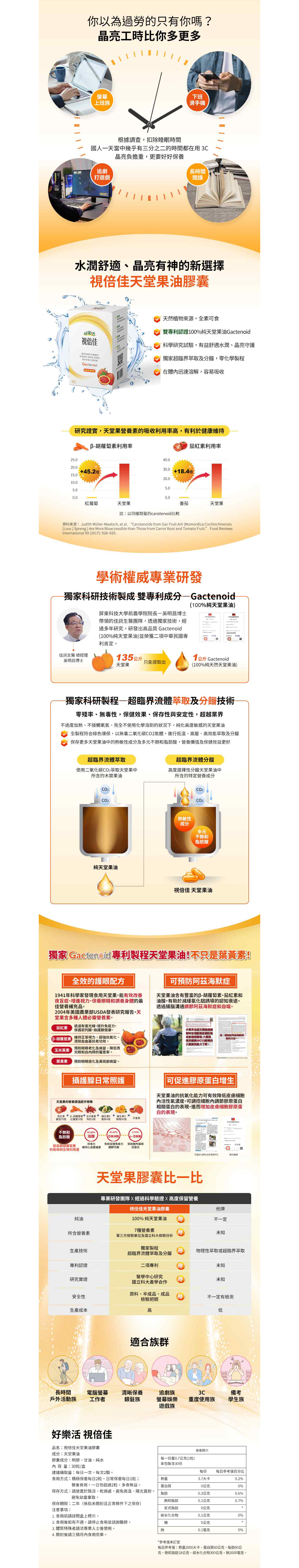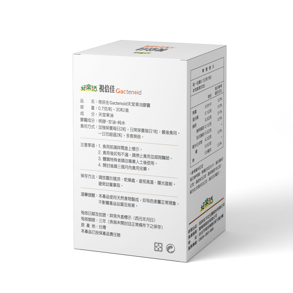 1.專業研發團隊,國立科大產學合作。 2.獨特超臨界萃取級分餾製程,高純度易吸收。 3.獨家雙專利認證,100%純木鱉果油Gactenoid。